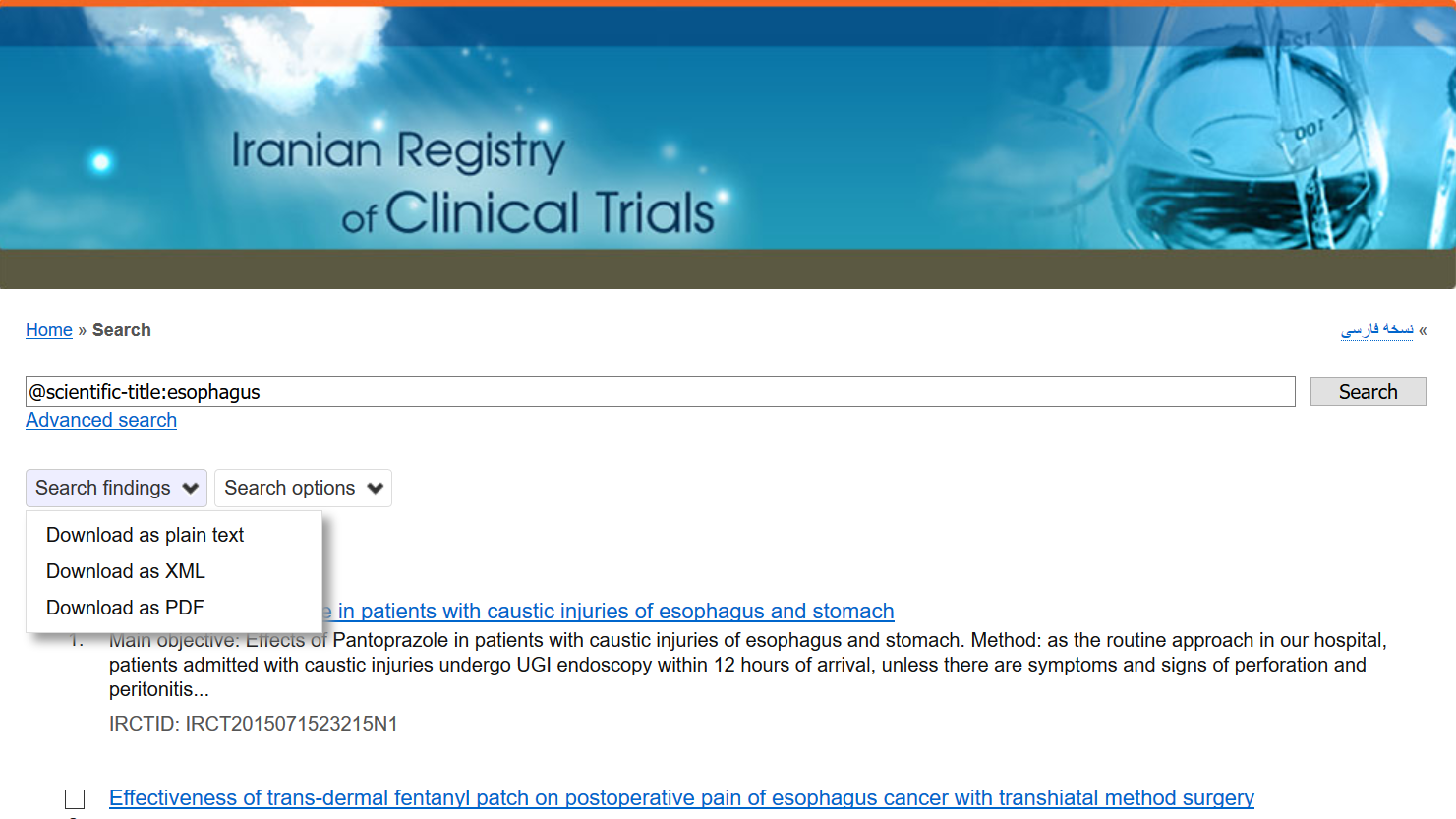 برای به همراه بردن نتایج سه روش پیش بینی شده است که در طی آنها نتایج به فرمت ها مختلف قابل دسترسی است. بدین منظور لطفا بر روی "خروجی جستجو" کلیک کنید تا گزینه ها در منو قابل مشاهده شود.