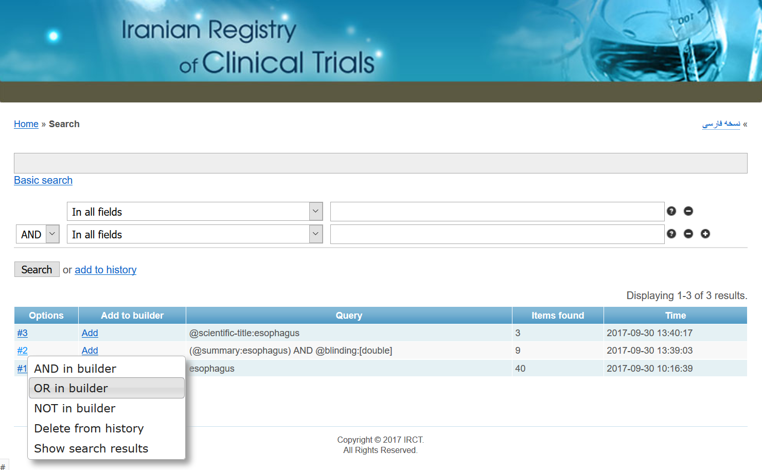 جستجو در خصوص یک جنبه مشخص از یک موضوع باید در ابتدا بصورت گسترده انجام شود وعبارات جستجو شده باید طوری انتخاب شده باشند که کلیه پروتوکل هایی که به نوعی با موضوع در ارتباطند در فاز اول جستجو در مجموعه پروتوکل های انتخاب شده ما قرار بگیرند. در فاز بعدی باید شروع به محدود کردن جستجوی خود بکنیم تا در نهایت فقط پروتوکل هایی که مستقیما به جنبه مشخص مورد نظر ما در خصوص موضوع اشاره دارند در گزینه هایی انتهایی باقی بمانند. مشخصه هایی که پالایش نتایج جستجو را در نرم افزار مرکز ثبت کارآزمایی بالینی ممکن می کنند در جستجوی پیشرفته پیش بینی شده اند. علاوه بر داشتن دسترسی به “AND”, “OR”, “NOT” تعداد پروتوکل های یافت شده در جستجوهای قبلی در این قسمت به شما نشان داده می شوند و امکان استفاده مجدد از آنها در شکل دهی عبارتهای جستجوی بعدی وجود دارد.